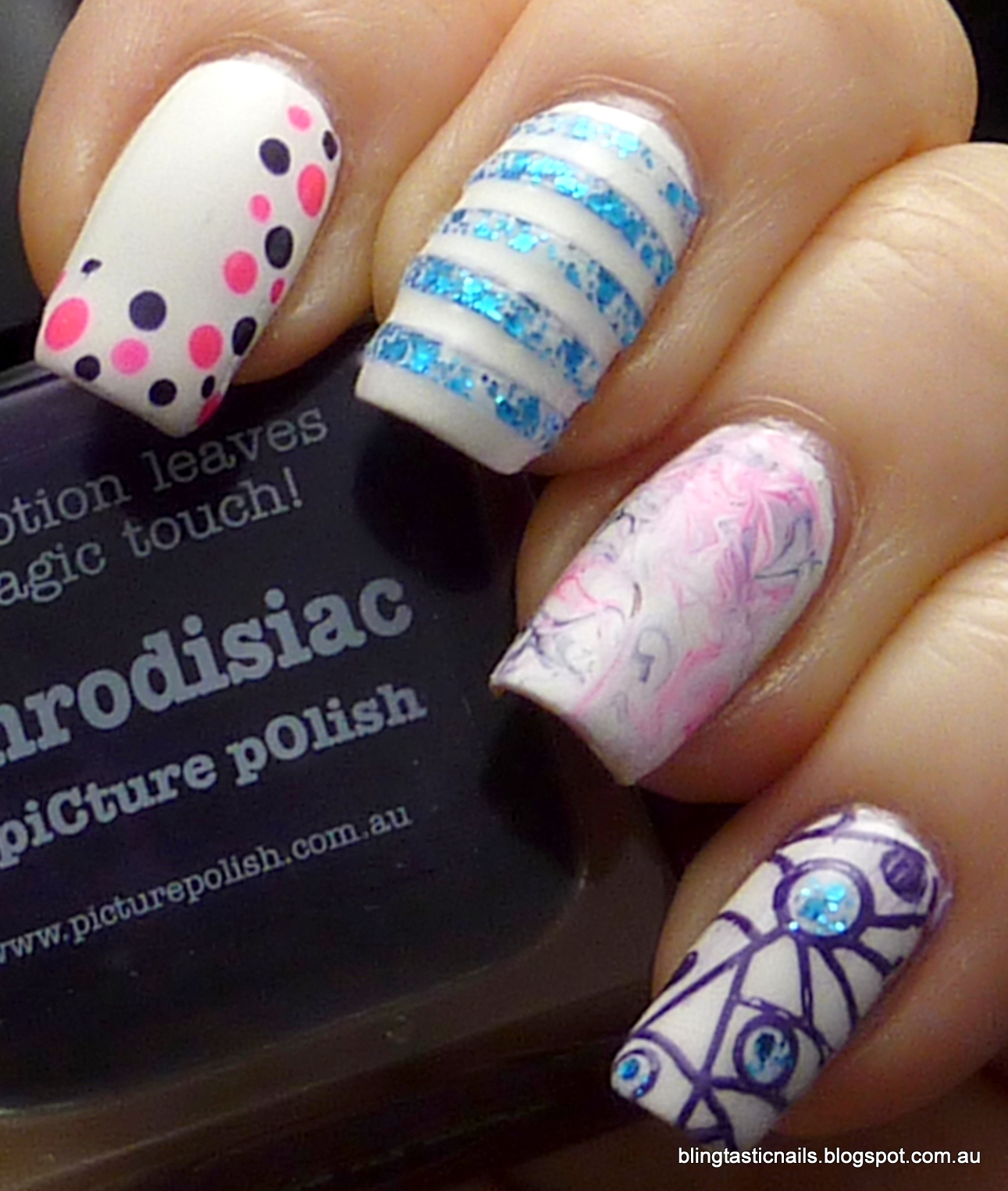 piCture pOlish sent me Aphrodisiac, which is a very dark purple, Splash a lovely blue multi shape glitter and Hot Lips a neon pink. Such different polishes, but all gorgeous in their own right. To make sure each polish would pop with the manicure I did a base of white and applied different nail art over the top. So how did I create the look below?